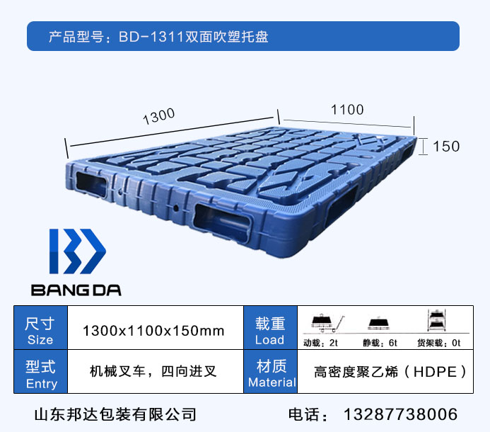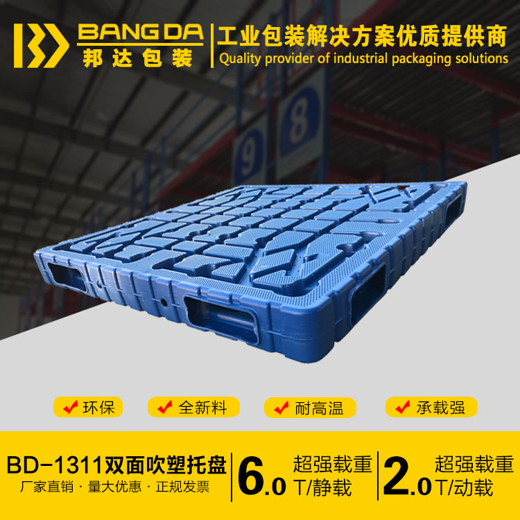 BD-1311雙面塑料托盤尺寸為1300*1100*150(mm),采用國內(nèi)最先進(jìn)的吹塑技術(shù),原材料采用的是HDPE一種結(jié)晶度高,非極性的熱塑性樹脂;邦達(dá)的雙面塑料托盤承載強(qiáng),耐高溫且環(huán)保;山東邦達(dá)包裝有限公司承諾旗下所有的產(chǎn)品均此采用全新材料,廠家直銷,正規(guī)發(fā)票,量大優(yōu)惠!