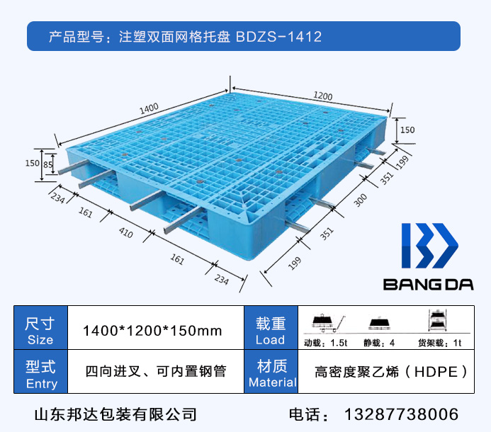 山東邦達(dá)包裝有限公司雙面網(wǎng)格塑料托盤型號(hào):