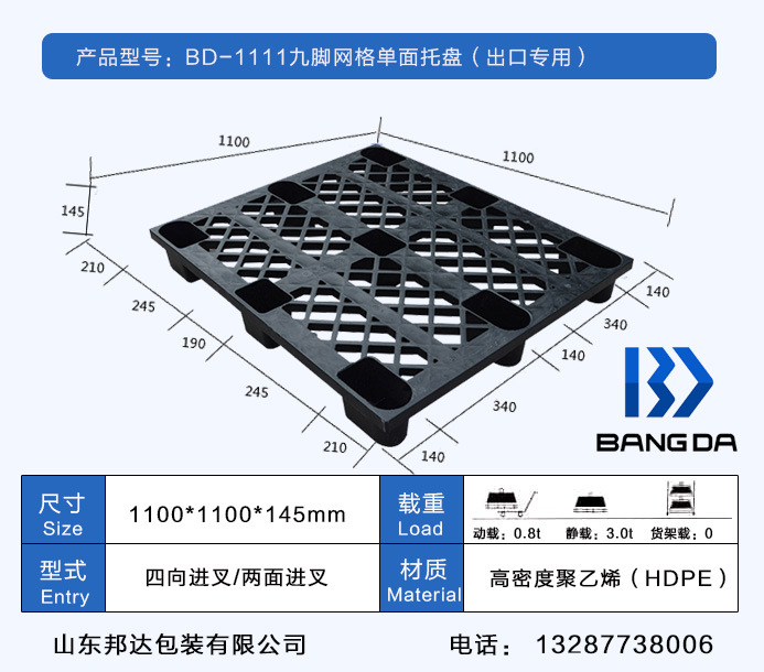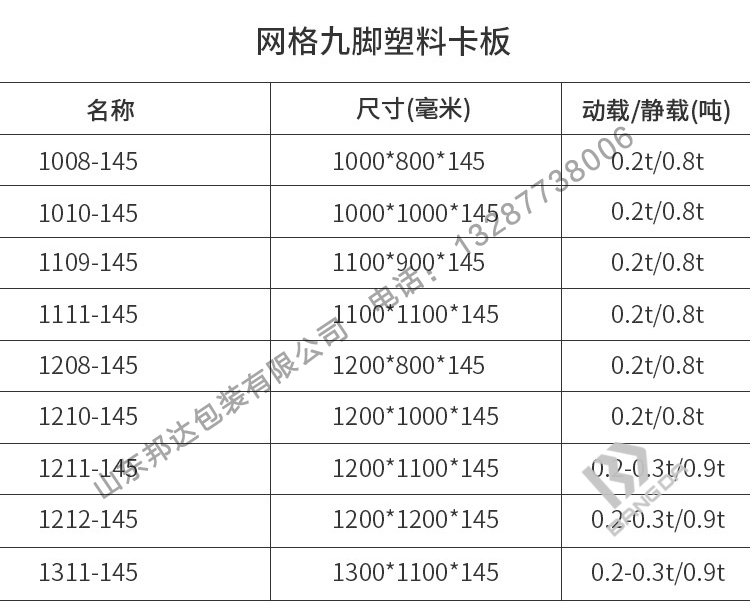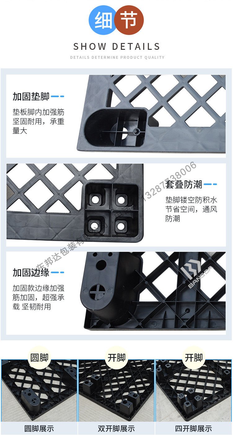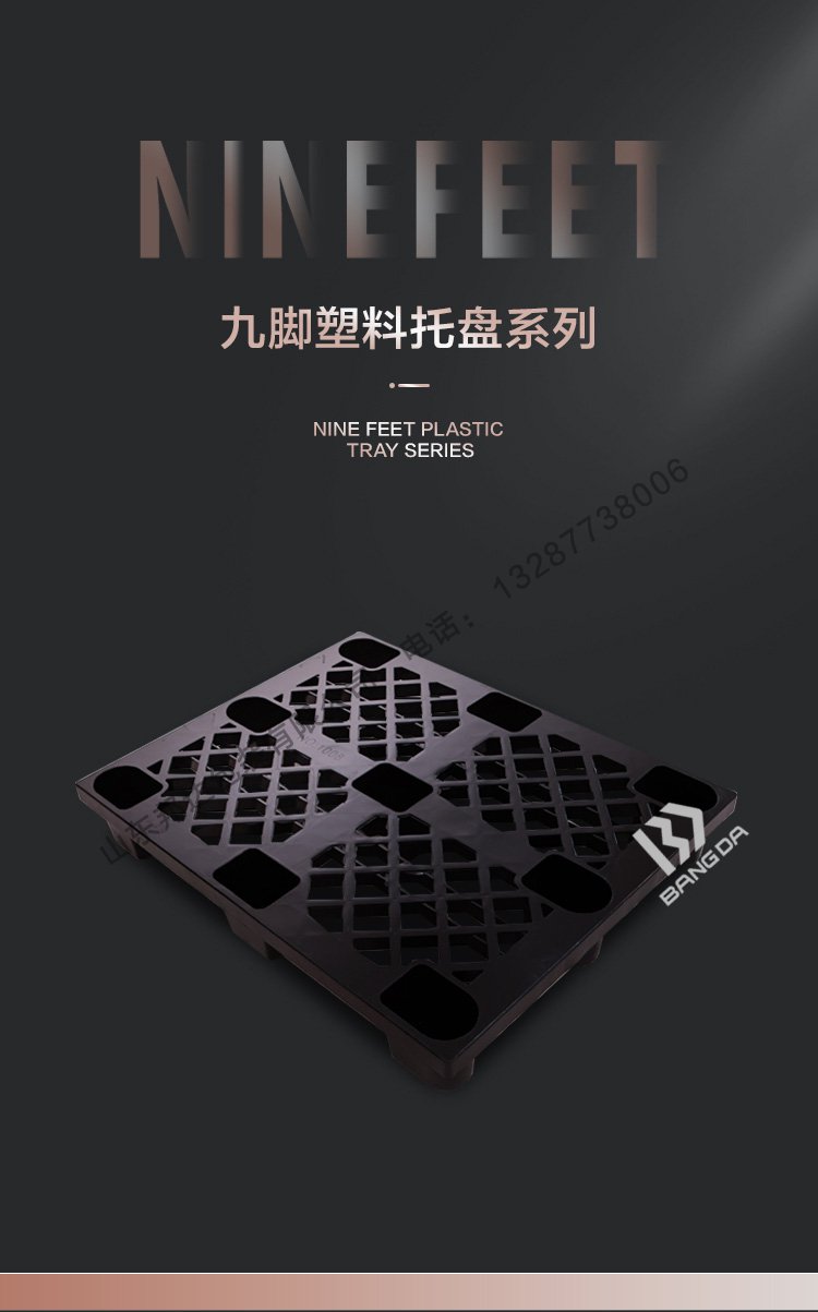 注:九腳網(wǎng)格托盤內(nèi)部可加入鋼管,是為了達(dá)到增加承載的目的,延長托盤的使用壽命,塑料托盤如要在低溫環(huán)境中長期使用,要選擇全新料生產(chǎn)的產(chǎn)品。