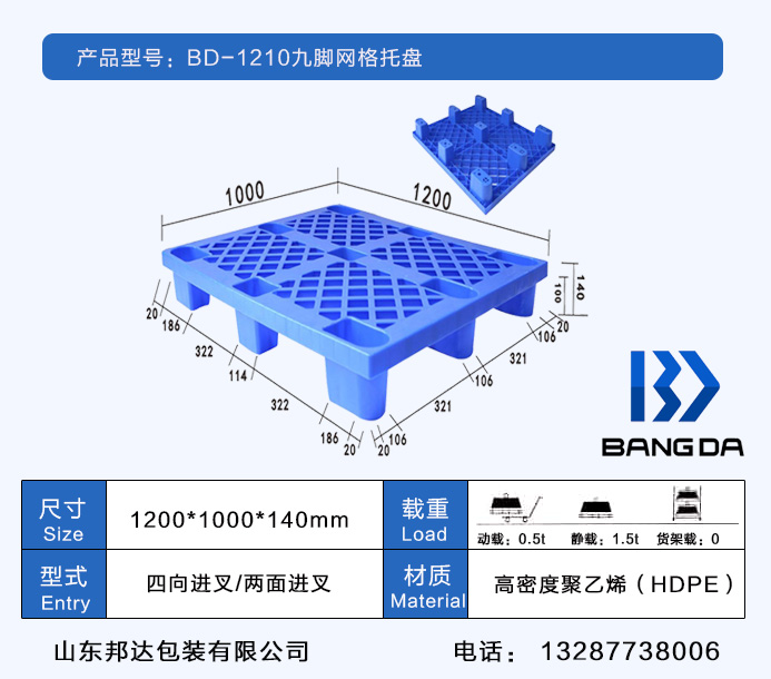 山東邦達(dá)包裝有限公司九腳塑料托盤(pán)系列型號(hào)尺寸有: